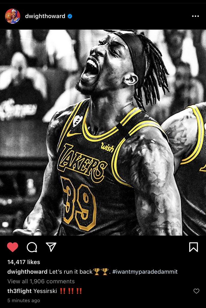 如今35岁的霍华德又回来了,老魔兽已经提前官宣重返湖人,更新Ins并且晒出身披湖人39号球衣照,配文:让我们再次夺得总冠军(两座冠军奖杯的表情)#我想要一个冠军游行。