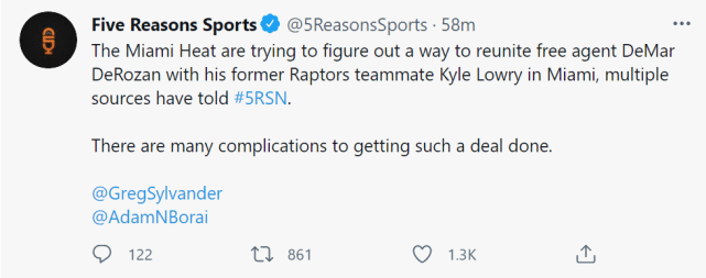 360直播吧讯 北京时间8月2日,据美媒Five Reasons Sports报道,多个消息源透露,热火正在尝试寻找同时得到洛瑞和德罗赞的方法,两位球星在今年夏天都将成为完全自由球员,他俩曾在猛龙共事6年。名记马克-斯坦恩也确认了这一消息。Five Reasons Sports还指出,要完成这个目标相当复杂。