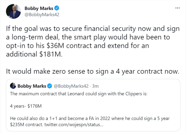 马克斯还报道成,小卡能和快船在今年夏天重新签下的最大合同是4年1.76亿美元,他也可以选择和快船签一份1+1的合同,在2022年再次成为自由球员,届时,他可以最多签一份5年2.35亿美元的顶薪合同。