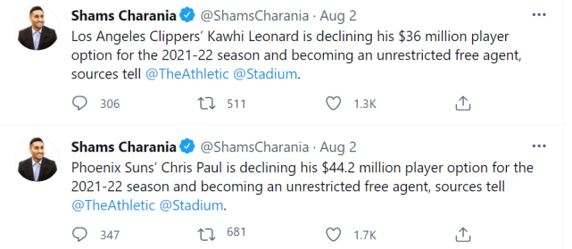 360直播吧讯 北京时间8月2日,据名记查拉尼亚道,太阳球星保罗和快船球星莱昂纳德都计划拒绝执行下赛季的球员选项,他俩都将成为不受限制的自由球员。保罗下赛季的年薪是4420万美元,小卡下赛季的年薪是3600万美元,两人都有望重新签下一份多年合同。