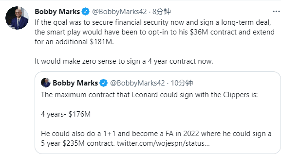 小卡该和快船新签一份什么样的合同?薪资专家Bobby Marks报道,小卡可以和快船直接签下一份4年1.76亿美元的大合同,他也可以和快船先签一份1+1合同,2年8060万美元合同并且拥有球员选项,然后在2022年有资格和快船新签5年2.35亿美元的超级顶薪合同。