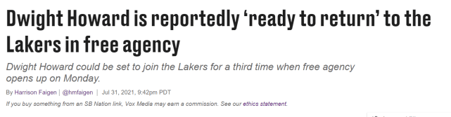 2012年8月,霍华德在一笔4人大交易中,被换到湖人队。他只打了一个赛季,场均贡献17.1分12.4篮板2.4盖帽,湖人在季后赛首轮被马刺横扫出局。当时,霍华德没有选择留队,而是以自由球员身份和火箭签约,结束了第一次湖人之旅。