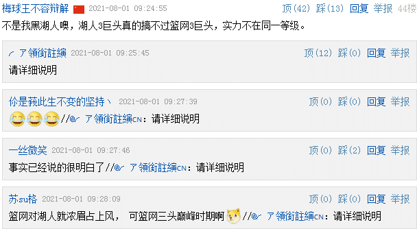 显然,也有网友认为湖人与篮网的实力不在一个等级,湖人球迷也借用杜兰特的话“请详细说明”,实际上论及湖人和篮网的三巨头阵容的缺点,可能扎心詹姆斯,因为湖人的缺点应该是最多以及最大的。