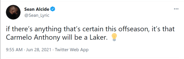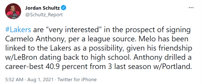 360直播吧讯北京时间8月1日,据NBA记者乔丹-斯库兹报道,联盟消息源透露,湖人非常有兴趣签下安东尼。斯库兹表示,甜瓜和詹姆斯的友谊可以追溯到高中时期,而上赛季他在开拓者投出了生涯最佳的三分命中率40.9%。这正是湖人目前最需要的技能。