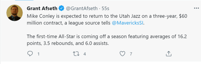 360直播吧讯北京时间8月1日,据NBA记者Grant Afseth报道,消息源透露,33岁的迈克-康利计划和爵士签下一份3年6000万美元的合同,此前,曾有记者爆料称康利可能签到一份3年7500万的合同,现在来看,他应该同意降薪留队了。