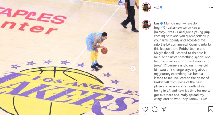360直播吧讯 北京时间7月31日,昨天湖人通过一笔交易把库兹马在内的多名球员打包送到了奇才,换回了三双机器威少。库兹马从登陆NBA后就一直在湖人打球,在被交易后,库兹马今天也是在社媒上发长文感谢了紫金军团,表示自己深爱洛杉矶,一日紫金终身湖人。