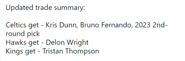 360直播吧讯 北京时间7月31日,国王、凯尔特人和老鹰正式达成了一笔3队5人交易协议。凯尔特人得到老鹰的后卫克里斯-邓恩、前锋费尔南多、2023年的次轮签(来自老鹰),国王得到凯尔特人的中锋特里斯坦-汤普森,老鹰得到国王的后卫德朗-莱特。