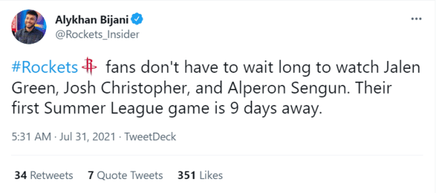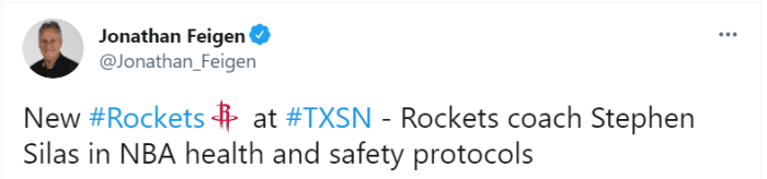 360直播吧讯 北京时间7月31日,休斯顿火箭召开了新秀见面会,除了正在征战奥运会的加鲁巴,其余三位被火箭选中的首轮秀都正式亮相休城。总经理斯通对三位新秀进行了逐一介绍,不过主帅塞拉斯并未来到现场。火箭记者费根报道称,赛拉斯因触发健康安全协议被隔离。