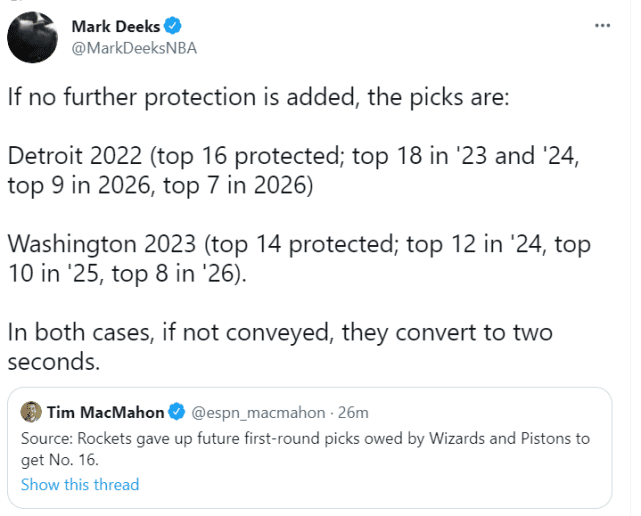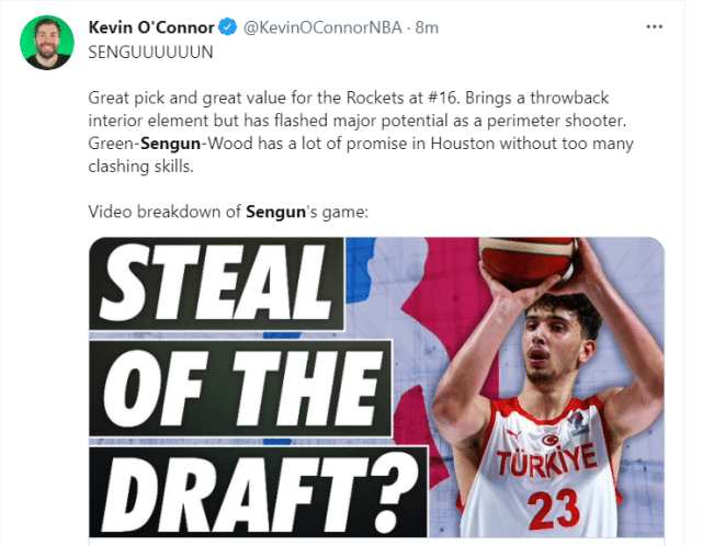 360直播吧讯 北京时间7月30日,2021年选秀大会上,火箭用未来的两个受保护的首轮签(来自活塞和奇才),换来雷霆的首轮第16号签,并用16号签选中了土耳其超级联赛MVP阿尔佩伦-申京。NBA名记奥康纳感慨火箭这次选择大赚。