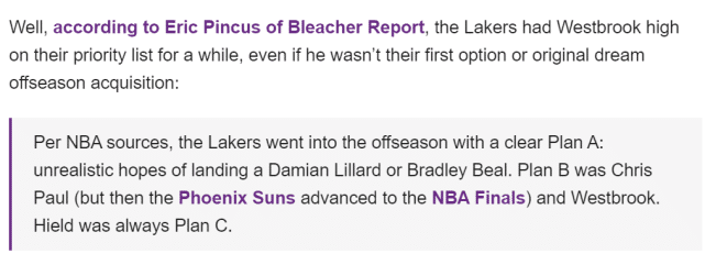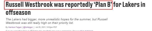 360直播吧讯 北京时间7月30日,湖人和奇才达成一笔关于交易威少的协议。湖人送出库兹马、波普、哈雷尔和今年的22号首轮签,从奇才得到威少、2024年的次轮签和2028年的次轮签。随后,Bleacher Report记者Eric Pincus曝光了交易的内幕。威少确实在湖人引援名单上靠前的位置,但他其实只是球队的B计划。