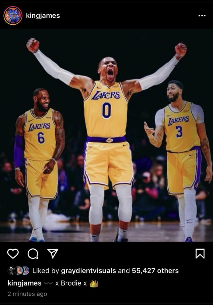 刚不久36岁的詹姆斯更新社交媒体,晒出詹姆斯、威少和浓眉三巨头合影,并且配上三人的绰号;詹姆斯正式宣布威少加盟,再加上威少正式告别奇才,这相当于官宣交易达成。
