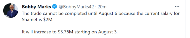 薪金专家鲍比-马克斯跟进报道称,这笔交易要到当地时间8月6日才能正式完成。因为目前沙梅特的薪水只有200万,而届时他的年薪将升至376万。