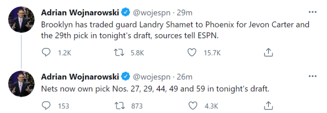 360直播吧讯 北京时间7月30日,据ESPN名记沃纳罗斯基报道,篮网和太阳达成了一笔1换2的交易协议。他们将沙梅特送至太阳,换回杰文-卡特和今年的29号签。这样一来,篮网在今天的选秀大会上拥有27号签、29号签、44号签、49号签和59号签。