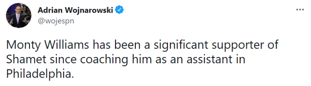 沃纳罗斯基表示,太阳主帅蒙蒂-威廉姆斯是沙梅特的重要支持者,他在费城担任助教时,曾经和当时效力76人的沙梅特有过合作。