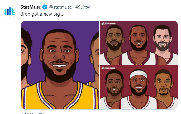 据美媒StatMuse统计,这是詹姆斯职业生涯第三次组成“三巨头”阵容——热火时期詹姆斯、韦德和波什;骑士时期詹姆斯、欧文和乐福,如今湖人时期,詹姆斯联手威少和浓眉组成新三巨头;此前两次三巨头时期,詹姆斯都带队夺得总冠军。