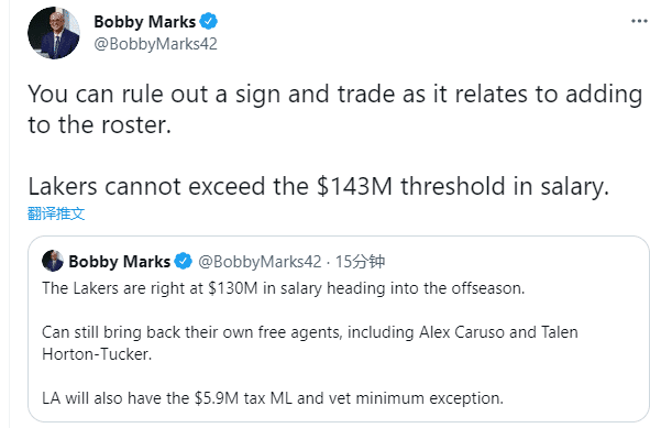 引援威少之后,薪资专家bobby marks分析湖人队的薪资情况,湖人仍旧可以带回自己的自由球员,包括卡鲁索和霍顿-塔克,湖人还有590万美元的中产特例和老将底薪;不过湖人下赛季总薪资不能超过1.43亿美元,而湖人三巨头年薪高达1.21亿美元,相当于仅剩2200万薪资空间,这将是湖人后续操作的难题。