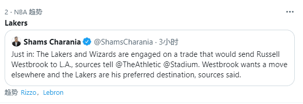 对于湖人引援威少,魔术师约翰逊发推:湖人国度,威少被交易到湖人的重磅交易令人兴奋,湖人肯定会成为新赛季总冠军的有力争夺者;现在湖人有了詹姆斯、浓眉和威少三巨头,我们现在还需要几个射手,我们很难被打败的。
