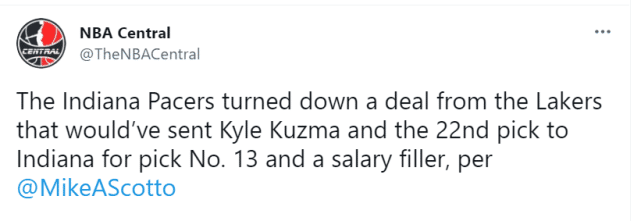 360直播吧讯 北京时间7月28日,据NBA记者Michael Scotto报道,消息人士透露,湖人希望打包库兹马和22号签换步行者的13号签和配平薪金的筹码,但是被后者拒绝。本赛季常规赛,库兹马场均12.9分6.2篮板1.9助攻,可季后赛只有场均6.3分3.8篮板1.2助攻的表现,投篮命中率29.2%,三分命中率17.4%,状态相当低迷。
