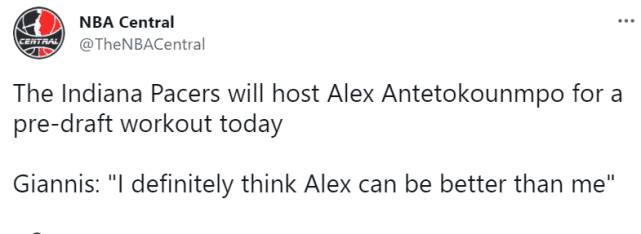 360直播吧讯 北京时间7月28日, 亚历克斯-阿德托昆博,字母哥的五弟完成了步行者的试训,将参加2021年NBA选秀。刚刚夺得总冠军和FMVP的字母哥,给了五弟很高的评价:“我绝对认为亚历克斯能比我更好。”