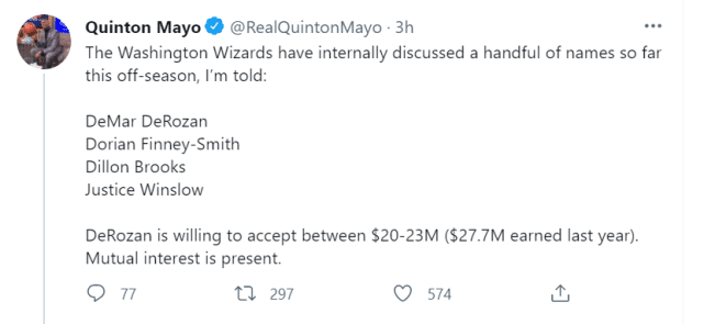 360直播吧讯 北京时间7月28日,据奇才记者Quinton Mayo报道,德罗赞出现在奇才内部讨论的引援名单上,他愿意接受的年薪范围是2000万-2300万美元之间(德罗赞2020-21赛季的薪水是2773万)。目前,德罗赞和奇才互有兴趣。除了德罗赞,奇才有意引进的球员还有独行侠的芬尼-史密斯、灰熊的狄龙-布鲁克斯和温斯洛。