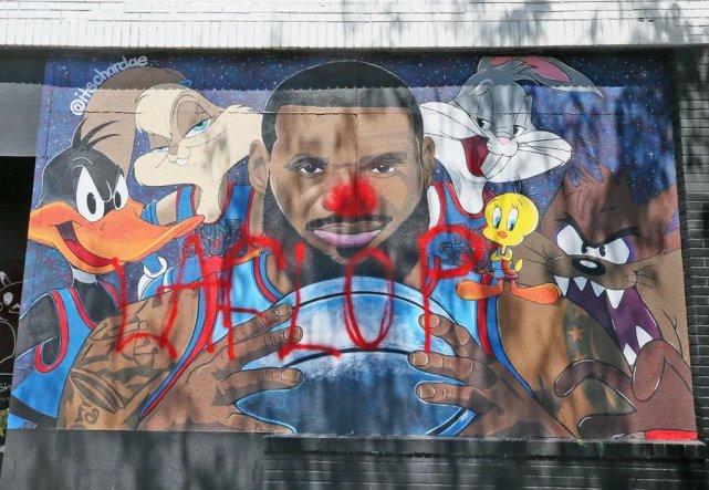 为了帮助詹姆斯宣传新电影,当地的球迷在墙壁上画出了一副巨型的詹姆斯壁画,可是让人没有想到的是,这副壁画被破坏了。