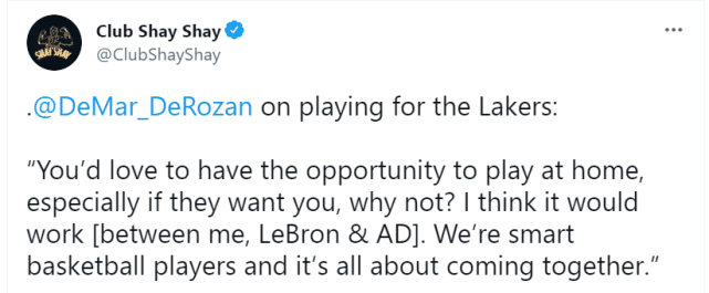 360直播吧讯 北京时间7月27日,即将成为自由球员的德罗赞,在一档节目中正式表态,愿意回到家乡洛杉矶打球,并相信自己和詹姆斯、浓眉能产生很好的化学反应,能够一起冲击总冠军。