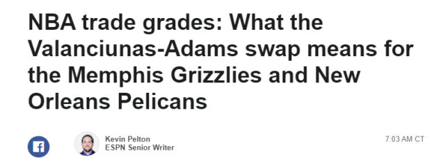 灰熊的评级略低于鹈鹕,但他们也获得自己想要的筹码。首先,他们通过交易得到亚当斯,这是一个主要承担防守任务的内线,因此,灰熊可以把更多的进攻配额留给小杰克逊,有利于这位年轻人的成长。佩尔顿直言小杰克逊是这笔交易的胜利者。