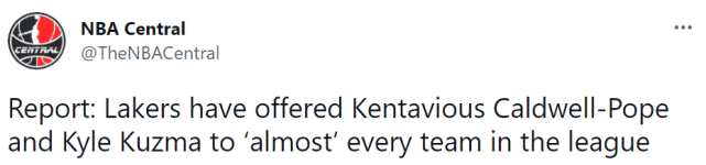 查拉尼亚报道称,湖人和国王已经进行了一笔关于巴迪-希尔德的交易谈判,消息源透露,库兹马在湖人的报价方案中。不少球队对库兹马感兴趣。以薪金配平的角度来说,库兹马无法单独用来换希尔德,但他将是报价中的关键组成部分。沃纳罗斯基报道称,除了库兹马,湖人还向不少球队兜售波普。