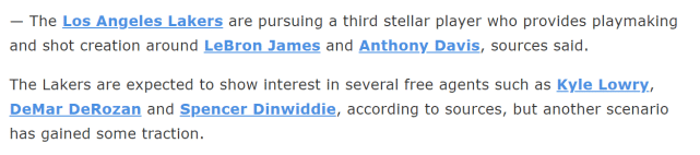 360直播吧讯 北京时间7月26日,名记查拉尼亚和沃纳罗斯基都报道了湖人的最新运作。这支在本赛季首轮就被淘汰的劲旅,正试图在休赛期补强阵容,力争在2021-22赛季重夺总冠军。