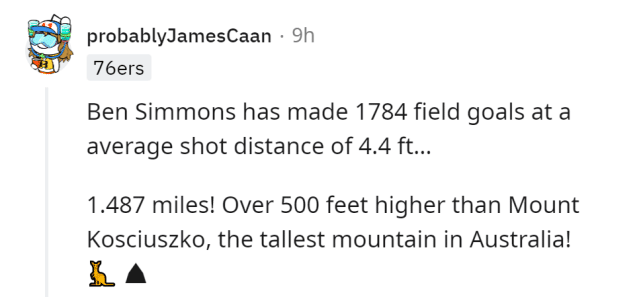 这位球迷写道:“西蒙斯已经投中1784球,而平均出手距离是4.4英尺(约1.34米),这样一算,他的进球总距离是1.487英里(约2393米),大概比澳大利亚最高的山峰科修斯科山(海拔2228米)还要高一些。”