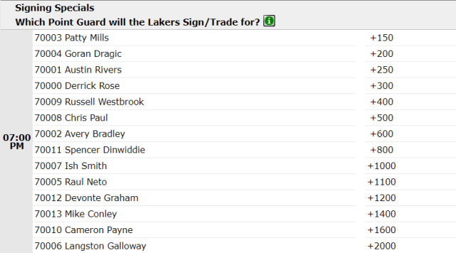 360直播吧讯 北京时间7月24日,湖人的休赛期目标之一,就是引进一位有经验的控卫,无论是通过签约还是交易的方式。如今,湖人控卫引援赔率也正式出炉。赔率榜上,高居首位的是马刺后卫帕蒂-米尔斯,罗斯、威少、保罗、丁威迪的名字也都在列。