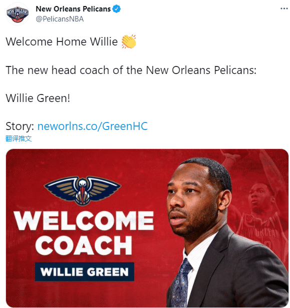360直播吧讯 北京时间7月23日,新奥尔良鹈鹕正式官宣新教练,晒照并且发推写道:欢迎威利回家,鹈鹕队新主帅,威利-格林!