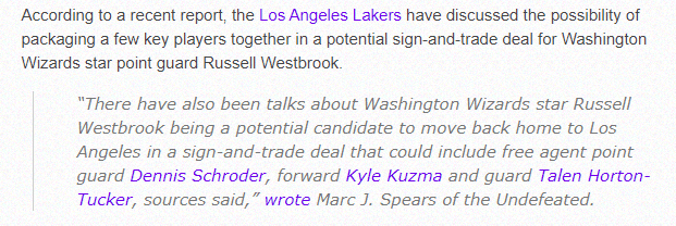 360直播吧讯 北京时间7月22日,湖人两大引援目标曝光,威少和保罗都在名单上,据名记Marc J Spears报道,湖人有兴趣交易得到威少,他们能提供的筹码是库兹马、塔克以及施罗德,其中施罗德需要湖人进行先签后换的操作;3换1引援威少吗?今年休赛期,湖人有意引援威少,打造詹姆斯+浓眉+威少的三巨头组合。