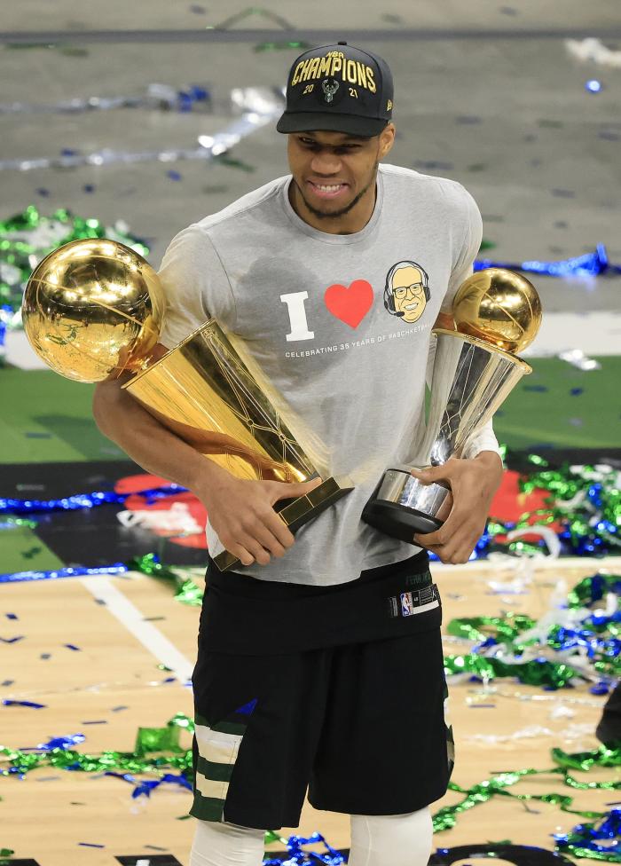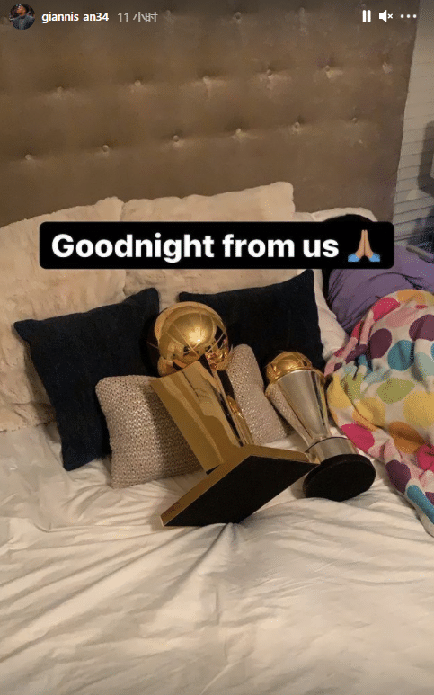 360直播吧讯 密尔沃基雄鹿4-2击败太阳夺得总冠军之后,字母哥第一个把总冠军奖杯带回家,并且抱着奥布莱恩杯和FMVP奖杯睡觉;总决赛G6字母哥狂砍50分14篮板5盖帽,总决赛场均35+13全票当选FMVP。