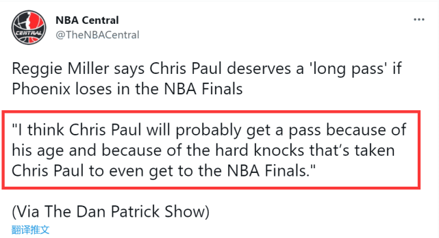 如果太阳最终无缘总冠军,保罗应该被责怪吗?NBA名宿米勒表示:我认为保罗会因为他36岁的年龄而获得谅解。他打进总决赛的过程经历了很多困难(此前遭遇了肩伤和右手韧带部分撕裂),大家都知道他在之前的季后赛中打得多么出色,他只是在总决赛发挥不佳!