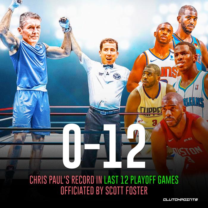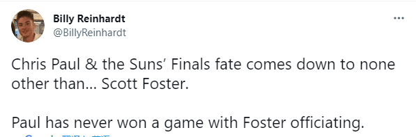 篮网记者Billy Reinhardt发推写道:保罗和太阳的总决赛命运取决于斯科特-福斯特,而保罗从来没有赢过福斯特吹罚过的季后赛。