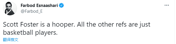 总决赛G6裁判出炉之后,美媒ClutchPoints发推:看到这样的裁判员,保罗和太阳会不开心的;快船记者Farbod Esnaashari发推:斯科特-福斯特是一个篮筐,而其他裁判都是球员。