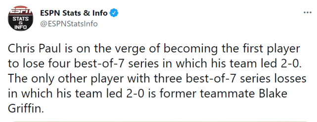 目前,保罗已经3次遭遇2-0领先的翻盘,与前队友格里芬并列排在首位。保罗的3次苦命经历分别是2008年季后赛次轮对马刺,2-0领先最终3-4被淘汰;2013年季后赛首轮对灰熊,2-0领先最终2-4被淘汰。2016年季后赛首轮对开拓者,2-0领先最终2-4被淘汰。