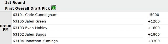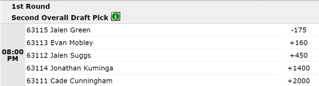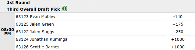 2021年探花的赔率榜上,莫布里(-140)居首,排名第二至五位的依次是格林(+175)、萨格斯(+250)、库明加(+1000)和巴恩斯(+1000)。