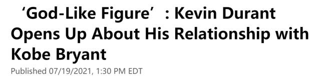 360直播吧讯 北京时间7月20日,在最近一次社媒互动中,NBA球星凯文-杜兰特再次提及科比-布莱恩特。杜兰特坦言,科比就像神一般的人物,自己在与黑曼巴的第一次季后赛较量中被他彻底征服了。