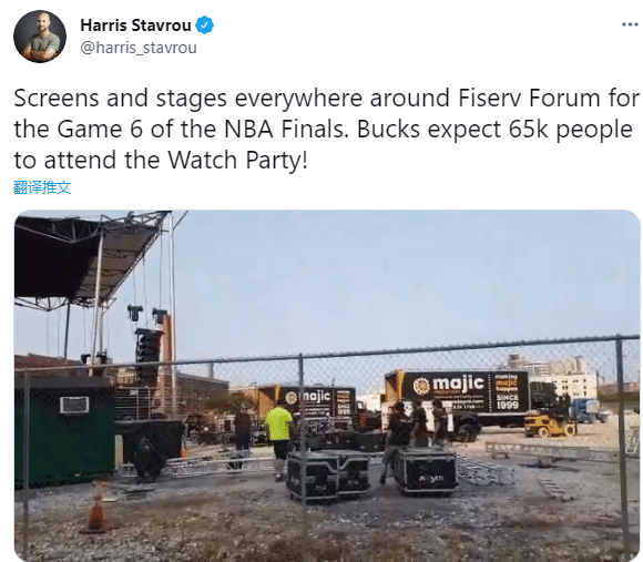 360直播吧讯 北京时间7月20日,雄鹿队已经准备好了庆祝夺冠,据名记Harris Stavrou报道,费哲论坛球馆外已经布满了舞台和屏幕,预计会有6.5万雄鹿球迷参与庆祝派对。