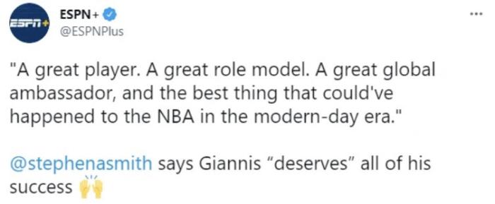 相对于CHRIS的评论,美国杨毅A史密斯的评论更加的直白,史密斯表示,字母哥是NBA这个时代所需要的球星,当所有人都在抱团的时候,他没有选择离开雄鹿加入超级球队,他是一个伟大的球员,一个优秀的榜样,他值得所有的荣誉。