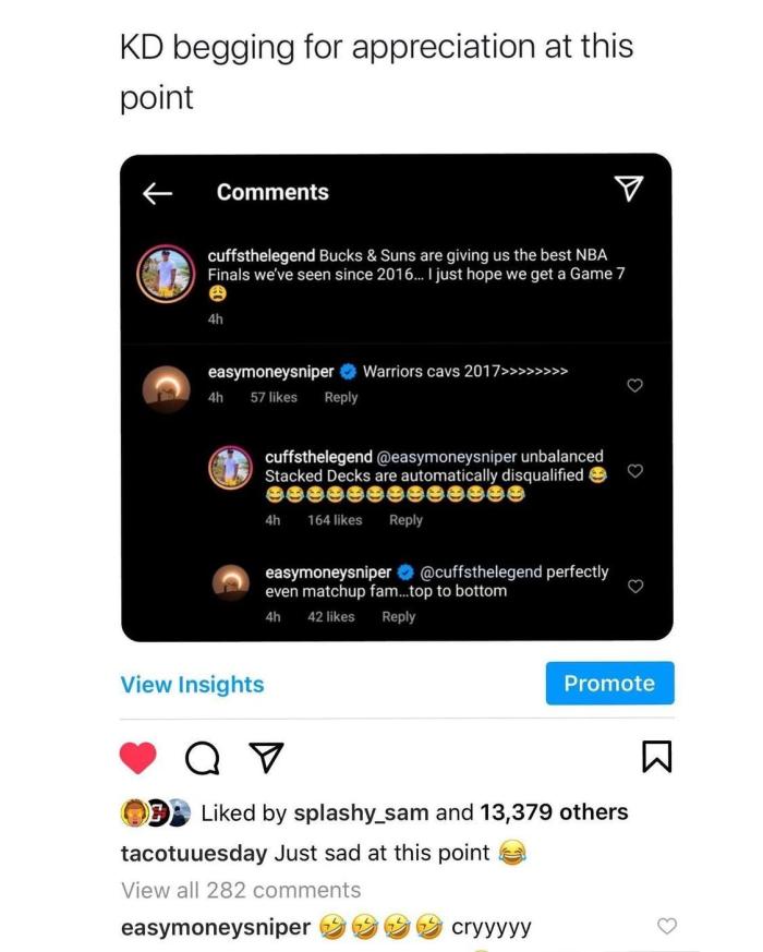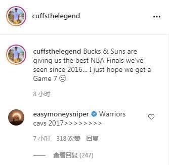 360直播吧讯 最近杜兰特在互联网上可是非常的忙,前有和网友在语音聊天室中争论,最近杜兰特又和网友在互联网上进行关于总决赛的互动。此前一位网友在互联网上说:今年的NBA总决赛是2016年之后最精彩的总决赛,希望能够打到7场比赛。而杜兰特则在这位网友下面评论道:2017年勇士VS骑士远大于今年。然后该网友回复到:实力悬殊的总决赛应该被自动排除。而杜兰特马上回复到:完全势均力敌的较量,老哥……从上到下都是如此。