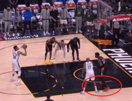这场比赛里,太阳的防守策略出现了明显的改变,为了抵挡前面几场比赛里,冲击内线予取予求的字母哥,太阳加大了对禁区的补防力度,有意识的去放雄鹿队的底角球员投三分,这样的防守策略无异于一场豪赌,如果雄鹿队三分手感不佳,太阳就可以打出优势局面,但是康诺顿,塔克和波蒂斯在底角经受住了考验,让太阳付出了代价。