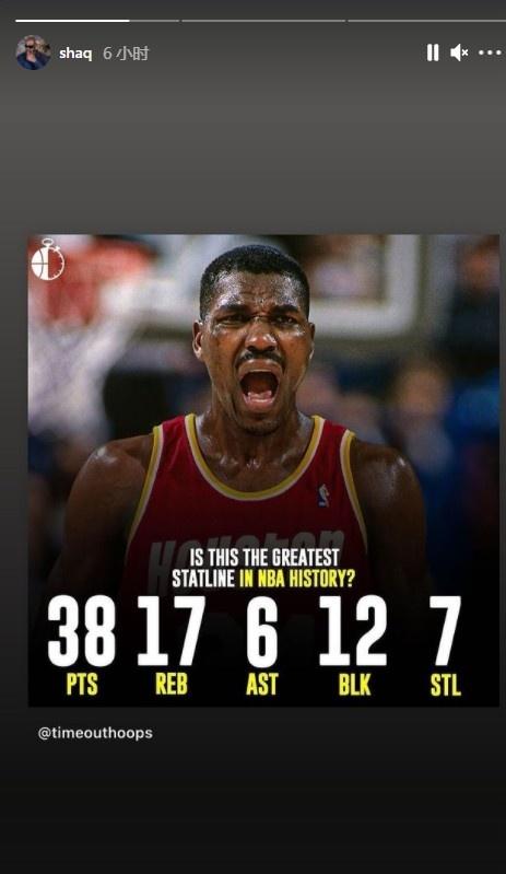 360直播吧讯 北京时间7月19日,NBA传奇中锋奥尼尔更新社媒动态,晒出了一张奥拉朱旺曾打出的单场梦幻数据:38分17板6助12帽7断。