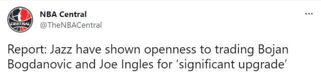 360直播吧讯 北京时间7月19日,据NBA记者Matt Moore报道,消息源透露,如果爵士能通过交易获得重大升级,他们愿意送出博格达诺维奇和英格尔斯。爵士下赛季的阵容预计会有一些变动,康利也将在休赛期成为不受限制的自由球员。