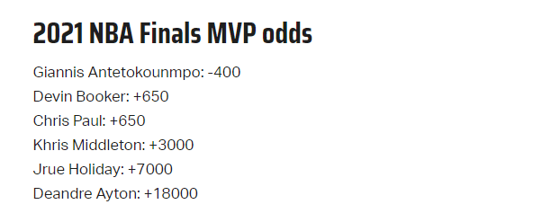 360直播吧讯 北京时间7月19日,雄鹿距离总冠军只差一步之遥,总决赛MVP(FMVP)的最新赔率也已出炉。字母哥的赔率是-400,已经遥遥领先其他球员,虽然仍有人在讨论若雄鹿夺冠,米德尔顿和霍乐迪是否有机会拿到这个奖项,但赔率方面认为悬念不大,字母哥的优势非常明显。