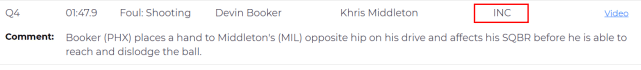 距离比赛结束还有1分47秒时,米德尔顿突破禁区,布克贴身防守。裁判报告指出,布克当时的手部有犯规动作,影响了米德尔顿的突破,这应该是一次防守犯规,但主裁判没有响哨,属于漏判。这次漏判太阳获利,雄鹿吃亏。
