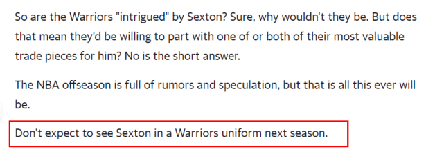 勇士的跟队记者Alex Didion解析了这一交易流言。他认为出于多方面原因,勇士得到塞克斯顿的机会很小,甚至近乎为零。