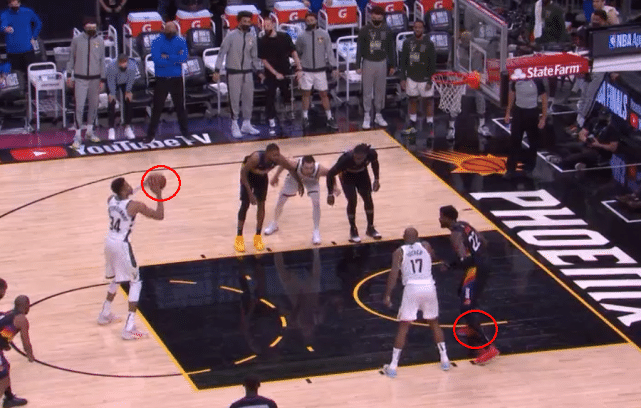 最后时刻,布克突破后的犹豫给了霍乐迪机会,霍乐迪一把将球从布克手中抢走,并快速推进,传球给字母哥完成了极限接力暴扣,也是这个球直接锁定了比赛的结果,赛后,很多球迷也质疑,霍乐迪这个球完成抢断的时候先犯规了,最后时刻的争议,再加上首节比赛,字母哥对于布克的恶犯被裁判时光倒流无视后,裁判也成为了本场的主角之一。